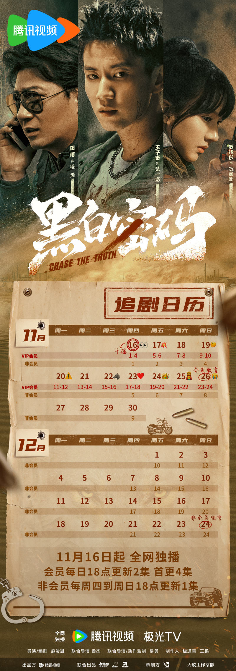 11月15日,王子奇、田雨、苏晓彤领衔主演电视剧《黑白密码》发布追剧日历。该剧共26集,于11月16日起在腾讯视频全网独播,会员每日18点更新2集,首更4集,将于11月26日迎来会员收官。