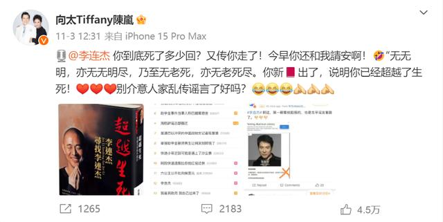 因病淡出银幕多年的李连杰曾多次被传去世。今年11月3日,李连杰好友“向太”陈岚也在微博发声为李连杰辟谣死讯。