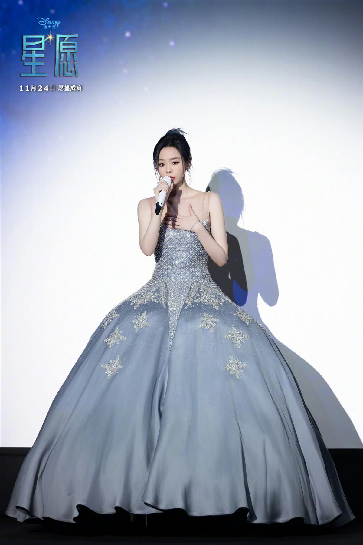 继真人版电影《花木兰》之后,著名女演员刘亦菲再次与迪士尼合作,为迪士尼最新出品的动画电影《星愿》配音。11月17日,《星愿》在上海举办首映礼,为该片担任配音演员的刘亦菲、于适,以及为迪士尼献唱的张靓颖、周深出席活动。在首映礼前的红毯环节,刘亦菲以紫色玫瑰裙造型亮相,被粉丝评价为“真人在逃公主”。