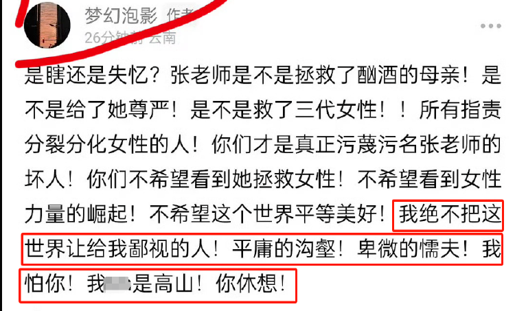 早在《我本是高山》首映前的9月份,就已经有人为这部影片的“口诛笔伐”做着铺垫。这些人依靠“男导演、男演员”,首先挑起性别对立的争论,表达着“男导演拍不好女性故事”的离奇逻辑;事实上,看过影片的观众都应该清楚地知道,本片对男性角色着墨极少,其中的每一位女教师、女学生都有着各自立体、丰富、生动的性格,都闪烁着真实的光彩,根本不存在消费女性、物化女性、贬低女性的现象。这些人通过断章取义,让人们只看到了“酗酒的母亲”,没有看到这个角色的后续:张校长不仅拯救了女孩儿,还拯救了这位母亲,让她也在华坪女高开启了自己新的人生——这个片中小小的段落正体现着张校长无私的爱和坚定的信仰,她不只是改变了一个个大山女孩的命运,更是改变着一种世俗的陈旧观念,而这种改变正推动着民族文明的进步。