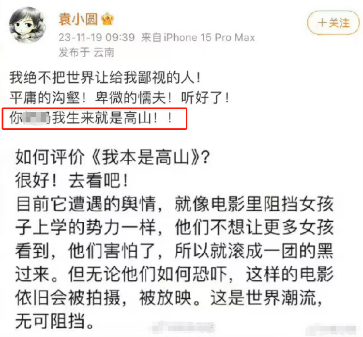 电影是遗憾的艺术,我们欢迎大家在看过影片后,对《我本是高山》发表真实的评论,也接受中肯的批评意见。真诚的沟通,对每一部中国电影、每一个中国电影人都有好处。但如若是那些丧失良心的杂音,辛勤耕耘的中国电影人承受不起,正在复苏的中国电影承受不起,正义的“六公主”也绝不接受!