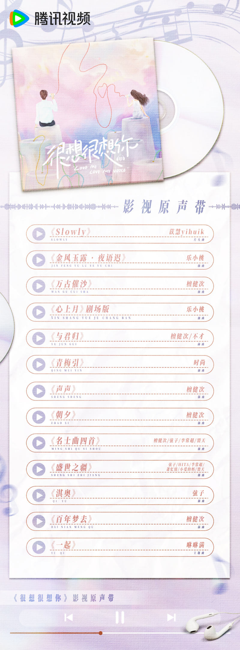 新京报讯 11月22日,檀健次、周也领衔主演的电视剧《很想很想你》公布了影视原声带全阵容。影视原声带中包括13首歌曲,该剧主演檀健次演唱了其中6首。