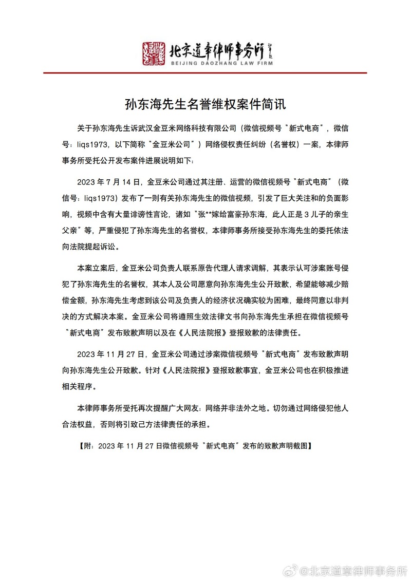 大皖新闻讯11月27日,@北京道章律师事务所 发布“孙东海先生名誉维权案件简讯”。其中提到,造谣孙东海是张柏芝三儿子父亲的自媒体账号运营者发布手写道歉信,表明此前发布的“张xx嫁给50个亿富豪孙东海,此人正是三儿子的亲生父亲”等为虚假言论。