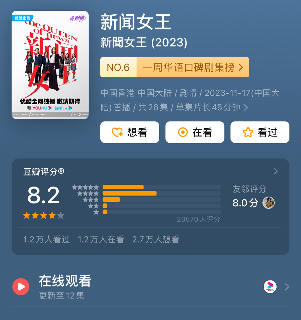 11月22日,正在优酷热播的《新闻女王》豆瓣开分7.9,两天内接连飙升至8.2,成为今年评分最高的港剧。这是去年优酷提出“新港剧”,与TVB、寰亚、邵氏等资深港剧制作方达成合作后,推出的又一部爆款。