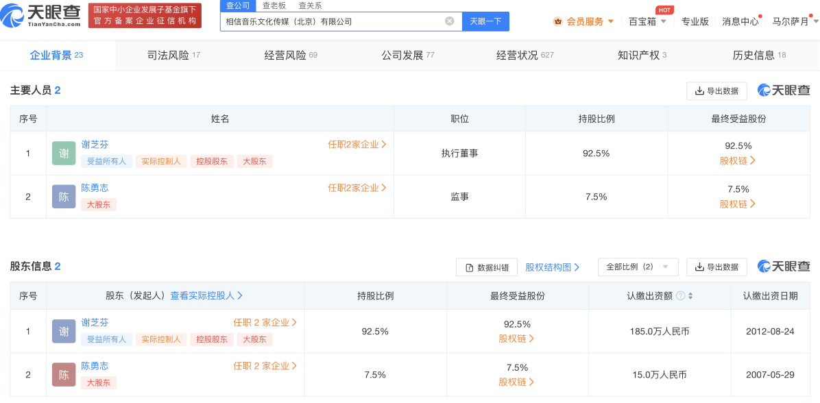 天眼查App显示,五月天经纪公司相信音乐文化传媒(北京)有限公司成立于2007年3月,法定代表人、执行董事为谢芝芬,监事为滚石唱片前执行长陈勇志,公司经营范围含组织文化艺术交流活动、项目策划与公关服务、版权代理、知识产权服务、演出经纪等,由谢芝芬、陈勇志分别持股92.5%、7.5%。2011年5月,该公司投资成立了相信音乐文化传播(上海)有限公司。年报信息显示,2022年,相信音乐文化传媒(北京)有限公司共有13人参保。