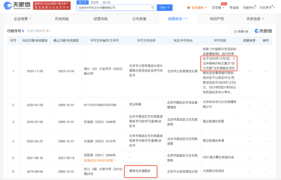 五月天上海演唱会主办方上海蕴华文化发展有限公司成立于2019年8月,法定代表人为余飞菲,注册资本1000万人民币,由上海华人文化演艺有限公司全资持股。年报信息显示,该公司2022年参保人数为0。五月天北京演唱会主办方北京华乐非凡文化传播有限公司成立于2018年6月,法定代表人为张熠明,注册资本500万人民币,由上海华人文化演艺有限公司、郜奇等共同持股。年报信息显示,该公司2022年参保人数为6。行政许可信息显示,该公司近期获王嘉尔“迈之克曼”北京演唱会安全许可。此前,该公司还曾获梁静茹、刘若英、八三夭等艺人或乐队演唱会相关许可。
