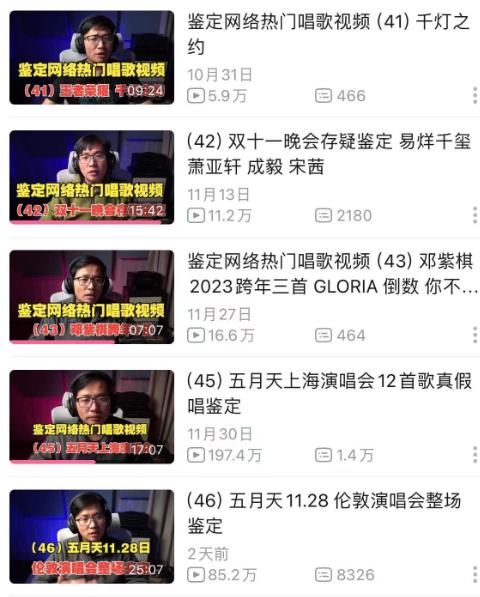在过去一年里,博主曾鉴定包括邓紫棋、易烊千玺、李玉刚等数十名艺人的唱歌视频。其中,在9月份发布的鉴定合集中,他也曾质疑多名艺人的演唱歌曲存在假唱、修音的情况。