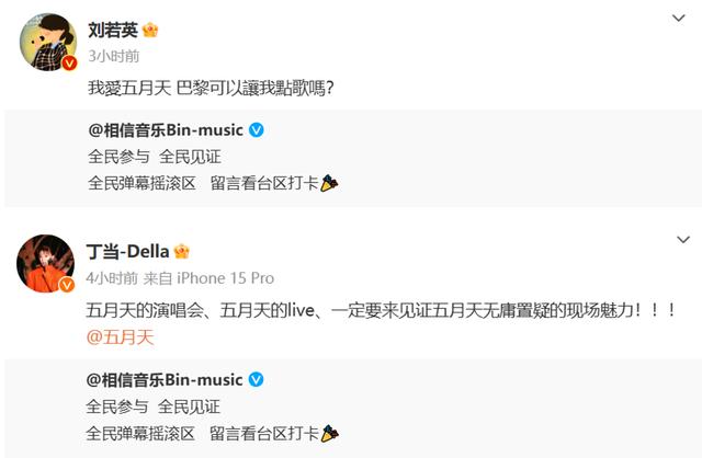 同日,歌手丁当、刘若英发布微博支持五月天,“我爱五月天”“一定要来见证五月天无庸置疑的现场魅力!”