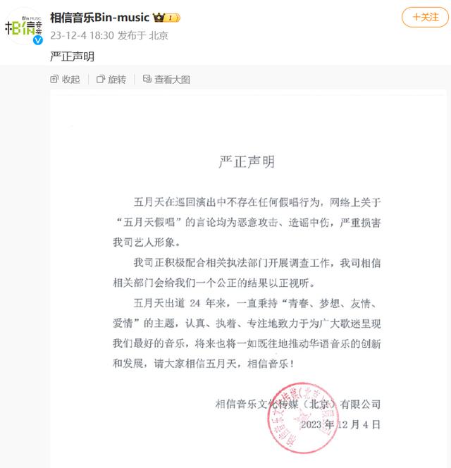 12月4日晚,五月天所属经纪公司相信音乐发布声明,称五月天在巡回演出中不存在任何假唱行为,网络上关于“五月天假唱”的言论均为恶意攻击、造谣中伤。