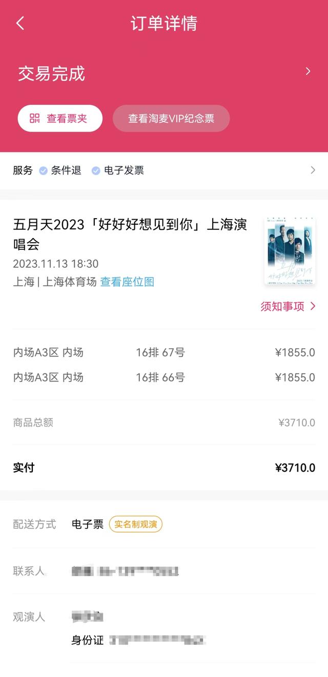 △徐先生五月天演唱会上海场的购票记录。图/受访者提供