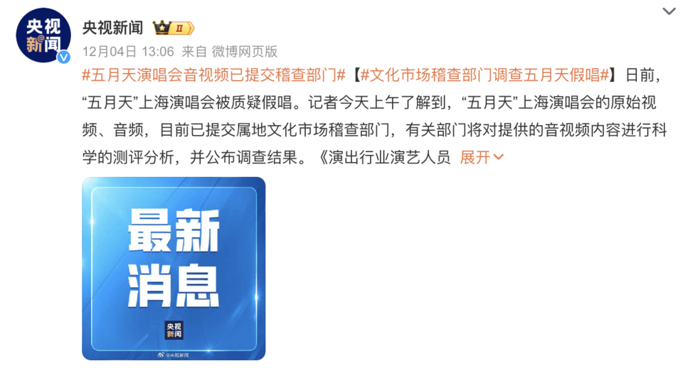 12月4日上午,中国演出行业协会表示,已关注到此事,目前正在等文化执法部门的处理结果。据了解,“五月天”上海演唱会的原始视频、音频,目前已提交属地文化市场稽查部门,有关部门将对提供的音视频内容进行科学的测评分析,并公布调查结果。