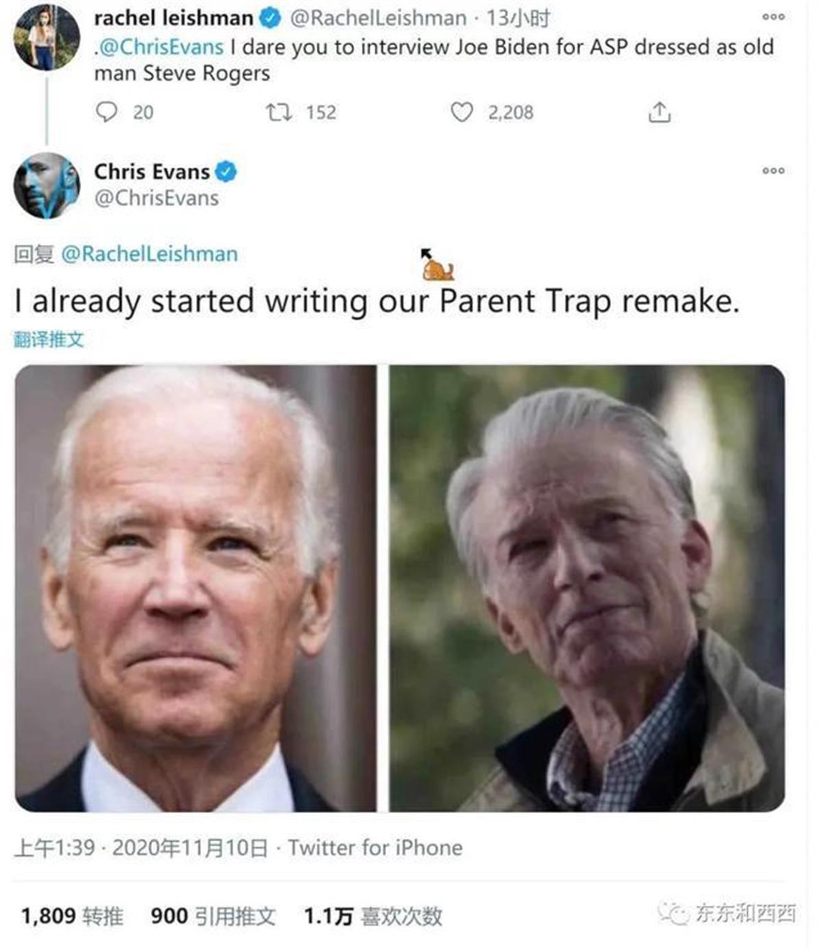 而令人感觉很逗趣的是,3年前《复仇者联盟4》上映时,有网友发现电影结尾“美国队长”的老年妆很像美国总统拜登,于是他将两张照片拼在一起,附上调侃式的文案:“要我来饰演拜登吗?倒也不是不能考虑。”并@了“美国队长”的扮演者克里斯·埃文斯,而演员本人还回复称,“我已经开始写《天生一对》的新版了!”据资料显示,《天生一对》是一部1998年的老电影,讲述的是一对双胞胎,从小被离异父母分开抚养,多年后偶然重逢再撮合父母的故事,可见,克里斯·埃文斯本人也觉得这个装扮和拜登十分相似。