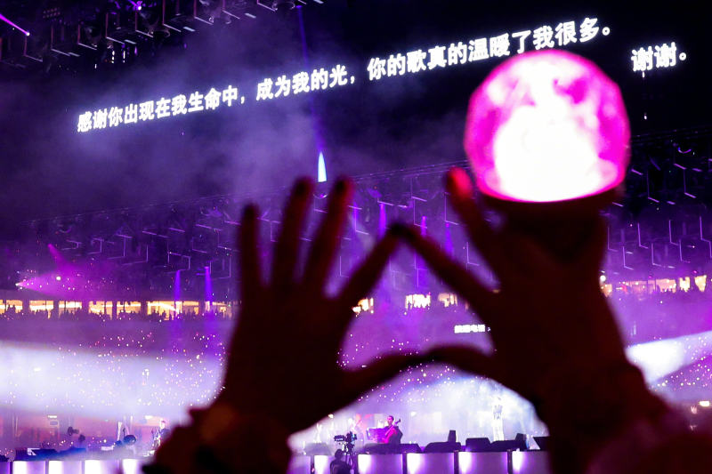 在今年9月举行的“ 2023华晨宇火星演唱会”鸟巢站上,配合《好想爱这个世界啊》大屏幕上滚动着很多弹幕。 图片来自华晨宇微博