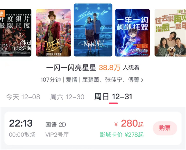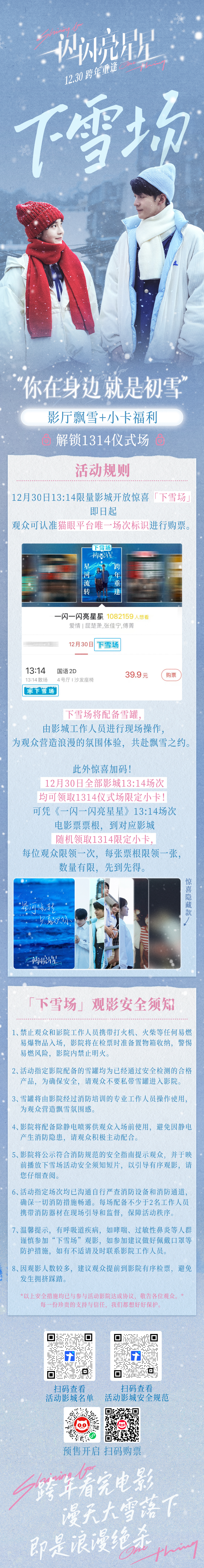 其次是电影精巧的宣发手段。《一闪一闪亮星星》票房疯涨是从12月5日开始的,这是因为片方当时推出的特殊活动。想必不少观众都知道,此前剧版最为出圈的梗当数“张万森,下雪了。”电影版便在此基础上策划了“下雪场”特殊场次观影活动,即在12月30日上映首日,全国共放映1314场13:14“下雪场”的特殊场次观影活动。届时该场次的观众可获得喷洒落地为泡沫质地的人工手持雪罐1瓶、影片限定人物小卡,将根据影厅座位数配发。这一极具跨年仪式感的观影活动,在各大社交平台的助推下,观众对影片的期待值逐步飙升。