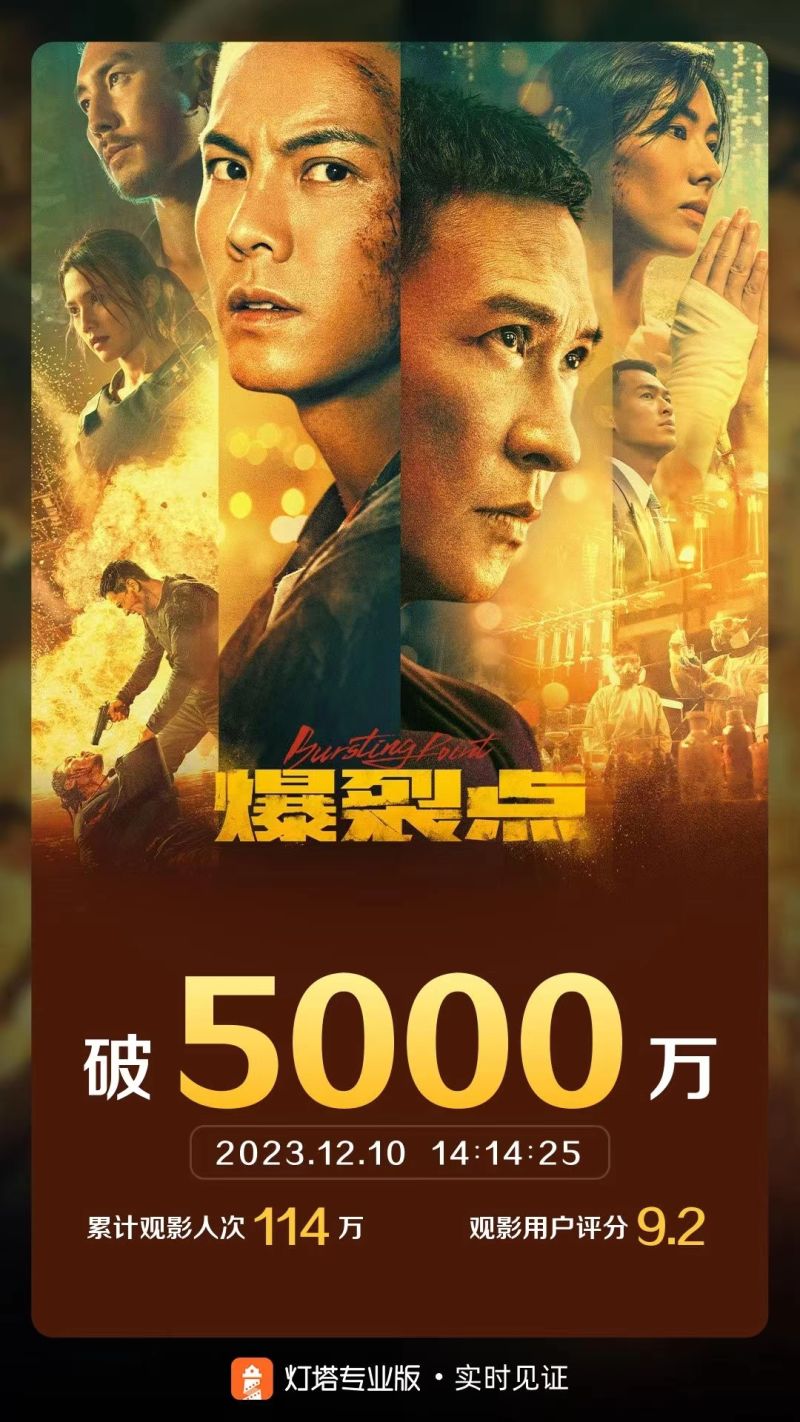 新京报讯12月10日,据灯塔专业版,今日下午2时14分25秒,电影《爆裂点》票房突破5000万,累计观影人数114万。该片于12月8日上映。