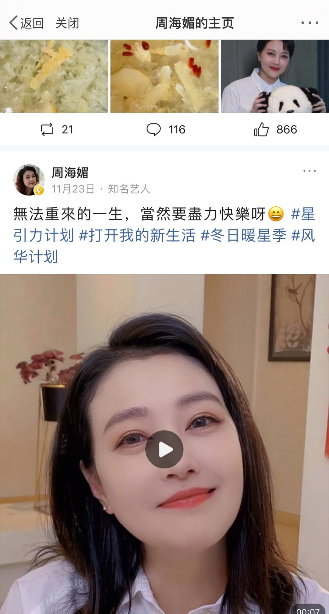 再在互联网上见到周海媚,她已经变成了爱分享美食的“周小厨”。她分享食谱、糖水的做法,与粉丝们同乐。11月23日,她写下“无法重来的一生,当然要尽力快乐啊”。