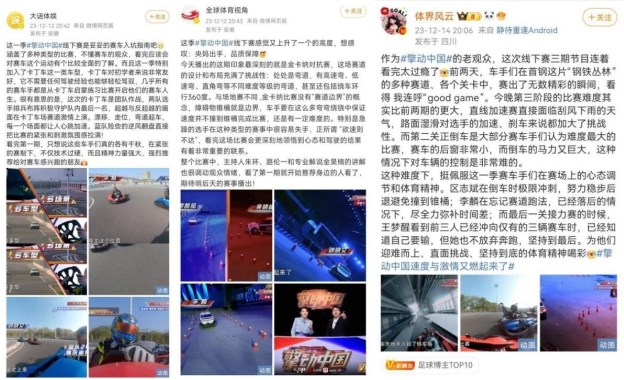 与此同时,多个体育类大V也以图文并茂的形式推荐《擎动中国》,肯定节目赛道设计和布局,为车手们迎难而上、直面挑战、坚持到底的体育精神喝彩。
