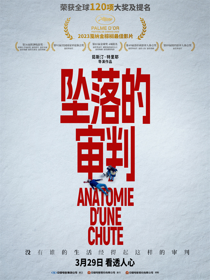现代快报讯(记者郑文静)2023年度第76届戛纳金棕榈奖最佳影片《坠落的审判》官宣定档2024年3月29日,并发布定档预告与定档海报,引发观众热烈讨论。过去几个月里,这部讲述婚姻与家庭真相的电影斩获无数奖项荣誉,不仅在金球奖获得4项提名,还横扫了全球47个电影节,荣获38个奖项、82个提名,包括欧洲电影奖、美国国家评论协会奖、洛杉矶影评人协会奖、纽约影评人协会奖、英国独立电影奖、悉尼电影节、布鲁塞尔国际电影节等各项专业大奖。