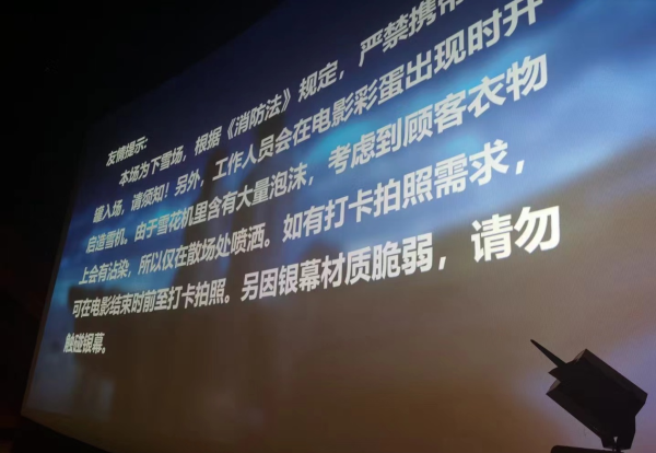 另一位上海郊区体量更小影院的负责人则很早就意识到,“下雪场”并不是容易的事,虽然他们影院为了卖票也采买了造雪机,但考虑到造雪机造雪的化学物质,多喷对影院座椅不好。而该片排片占比极大,为了卖票,这家影院的大部分场次都宣传了会“下雪”,造雪无疑加重了场次中间的清扫工作,对于人手紧张的影院来说加重负担。因此,这家影院选择的方式是“局部下雪”,在影片开场前,专门在银幕上做了提示,散场处喷洒供观众打卡拍照。