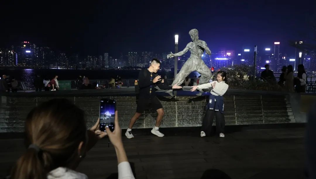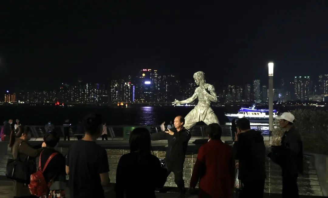 在香港星光大道李小龙铜像前,不论香港市民还是游客,都摆出招牌动作合影留念。深圳特区报记者耿超逸摄