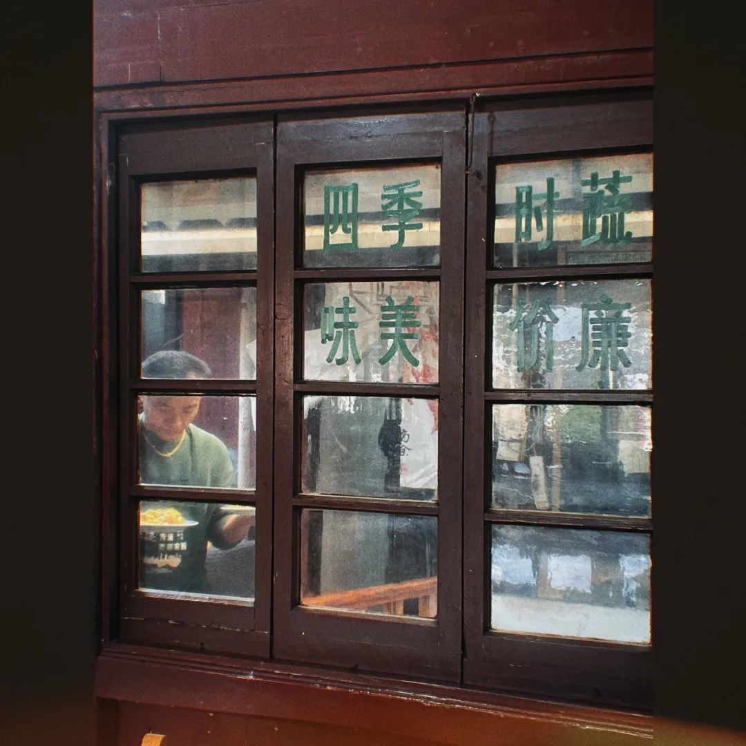 《繁花》取景地放生桥头的老东来餐馆,窗上还保留着剧组美工用绿漆写下的“四季时蔬味美价廉”。