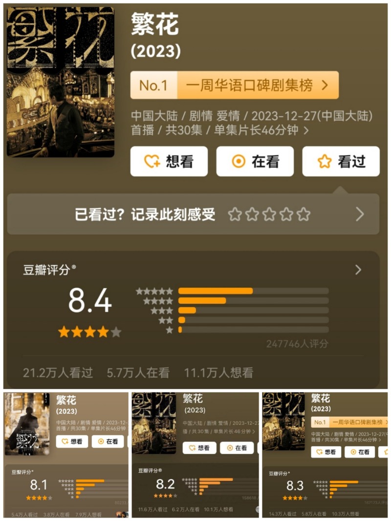 别不服气,《繁花》虽然在1月9日就已经收官了,但是这部已经收官的剧,仍然一直以另外一种方式在线,从开播到一大半,在豆瓣开出8.1分,接着飙升到8.3分,在收官之后,豆瓣评分逆袭到如今的8.4分。我一直以为它能站上8.5分的高位,就像我一直以为石宇奇在屠龙之后,应该会拿下大马公开赛的冠军。