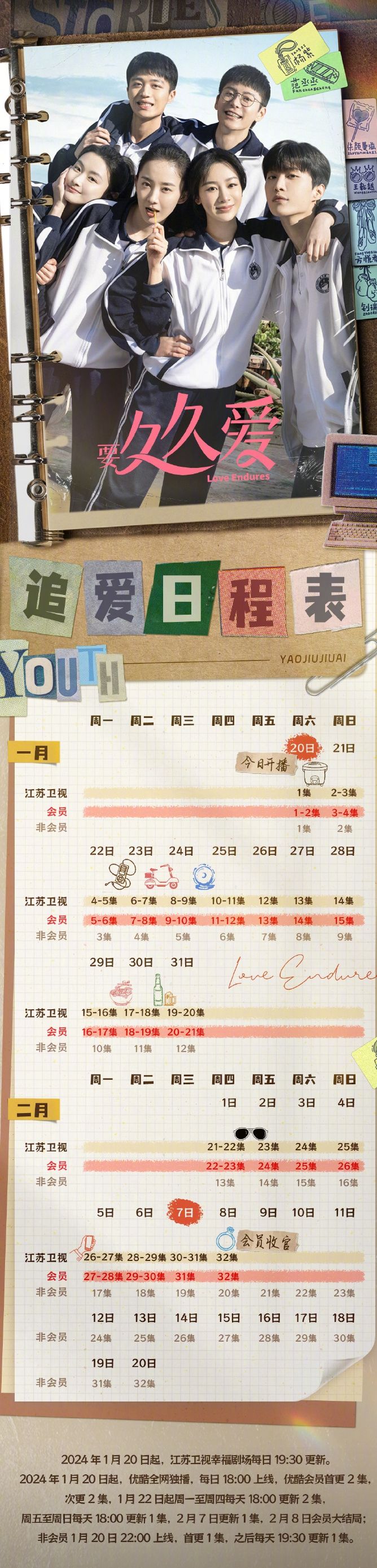 新京报讯1月20日,杨紫、范丞丞领衔主演的32集电视剧《要久久爱》发布追剧日历,宣布将于今晚(1月20日)起,在江苏卫视幸福剧场每日19:30更新。2024年1月20日起,优酷全网独播,每日18:00上线,优酷会员首更2集,次更2集,1月22日起周一至周四每天18:00更新2集,周五至周日每天18:00更新1集,2月7日更新1集,2月8日会员大结局。非会员1月20日22:00上线,之后每天19:30更新1集,也是在2月8日收官。