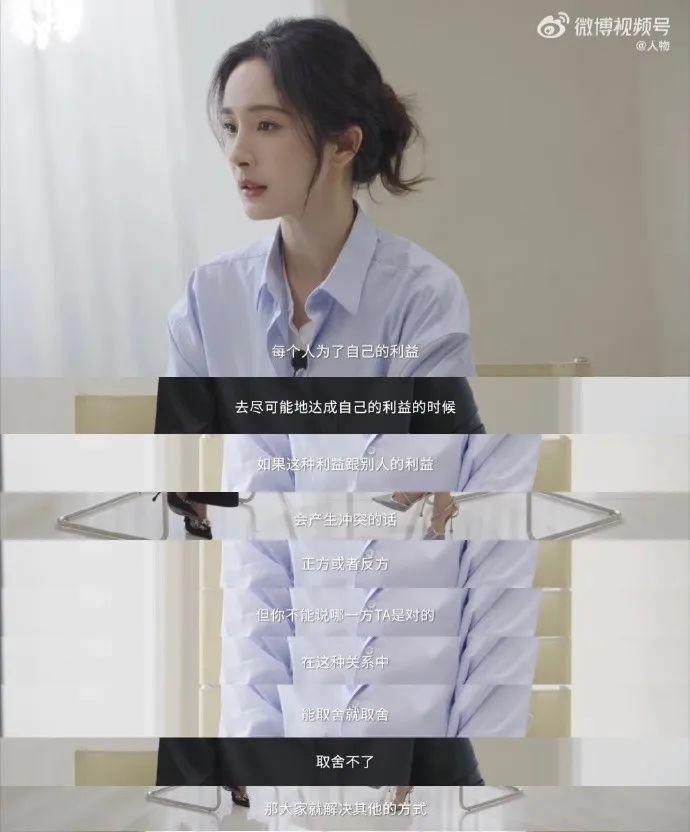 杨幂回应称:“江湖传闻有这么多,很多东西是我不了解的,我也不知道传闻传成这样是为什么。每个人为了自己的利益,去尽可能地达成自己利益的时候,如果这种利益跟别人的利益会产生冲突的话,大家自然而然成了正方或者反方,但你不能说哪一方是对的。那我觉得说,在这种关系中能取舍就取舍,上过班的都懂,能沟通就沟通,沟通不了就算了,都是有取舍的。”