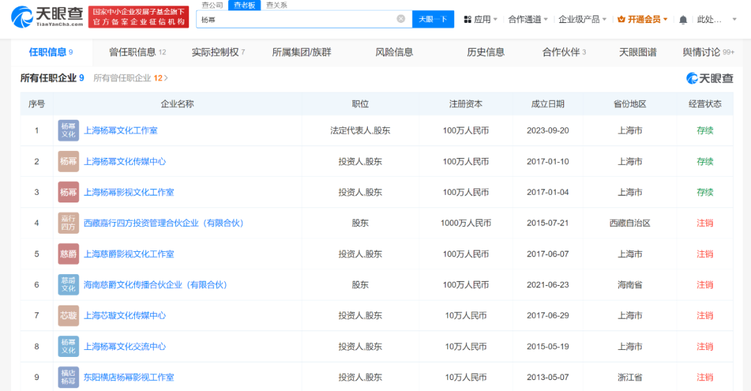 天眼查App显示,杨幂名下共关联9家企业,其中3家为存续状态,包括上海杨幂文化工作室、上海杨幂文化传媒中心、上海杨幂影视文化工作室,均为杨幂个人独资企业。值得一提的是,曾任职信息显示,杨幂曾为西安嘉行影视传媒股份有限公司股东,持股约15.19%,去年,杨幂退出该公司。目前,杨幂关联企业均与嘉行传媒无股权关联。