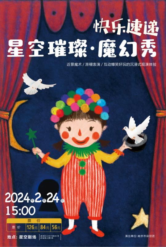 此外,元宵节当天,南京市杂技团还将在南京星空剧场带来一场《快乐速递-星空璀璨·魔幻秀》。现代快报记者了解到,这场魔术杂技秀把独特新颖的魔术和中国传统杂技结合,采用高科技手段的声、光、电,混合音乐舞蹈等多元化元素,融入青春与童趣的代表符号,很适合带小朋友一起去观看。
