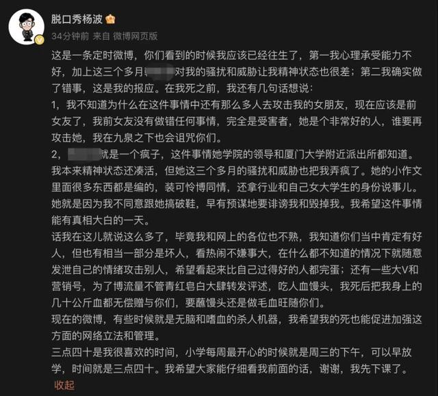 2月4日下午3时40分,脱口秀演员杨波发布一条定时微博,疑似因个人情感纠纷和网络暴力自杀。而一个多小时后,杨波个人微博再次发布内容,向网友报平安称“不好意思让大家担心了,为我的不成熟向所有人道歉!”潮新闻记者发现,截至发稿前,杨波个人微博已注销。
