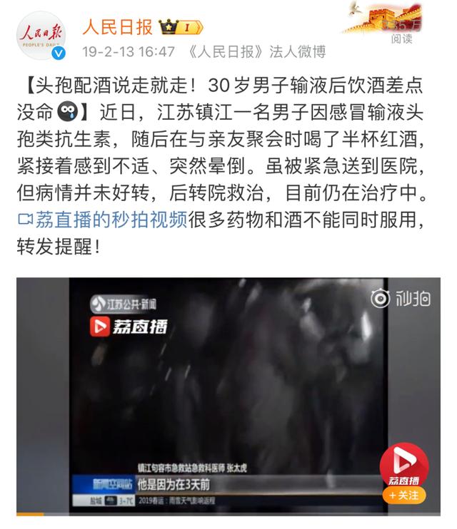 此外,人民日报也曾多次报道过类似事件,如“头孢输液两天后喝酒,35岁男子差点没命”、“头孢配酒说走就走,30岁男子输液后饮酒差点没命”等相关报道。