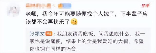 十多分钟后,张颂文就回复:“我朋友请我吃饭,问我想吃什么,我一般也是说随便,结果上的全是我爱吃的大餐,希望你也拥有同样的巧合。”