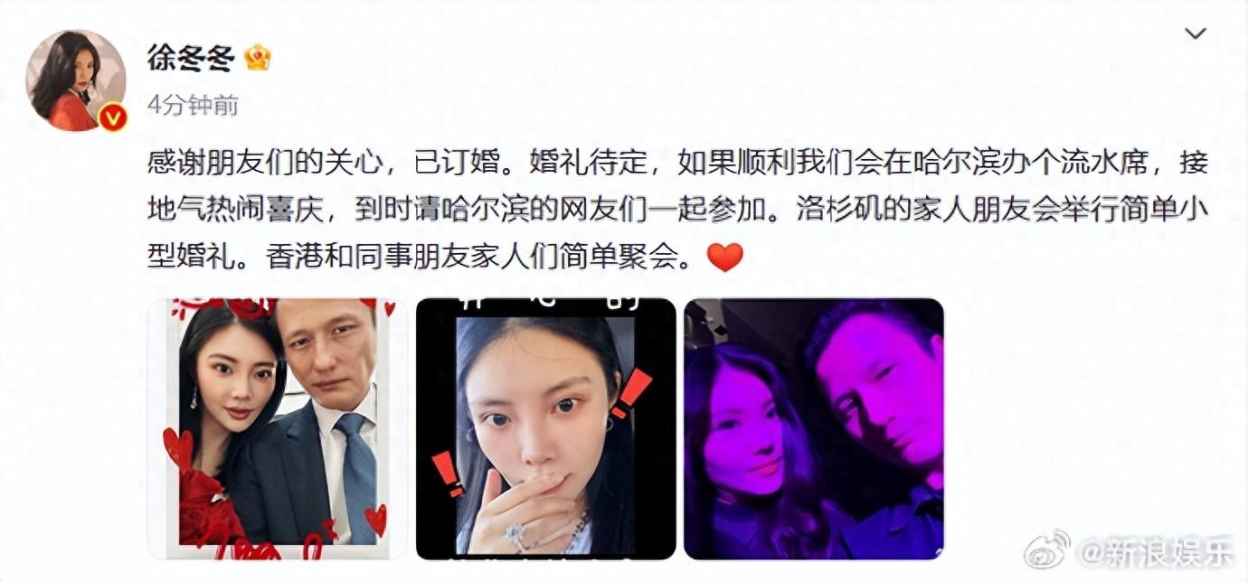18日,@徐冬冬宣布与男友@尹子維Terence订婚,晒出巨大的订婚戒指,透露到时候会在哈尔滨办个流水席,洛杉矶举行简单小型婚礼,香港简单聚会。随后,尹子维转发表示:“我们已订婚!The best day of my life! ”