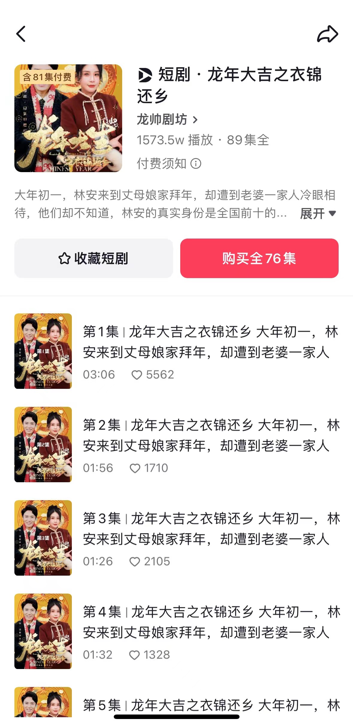 再如春节期间,达到千万级流量峰值的短剧《龙年大吉之衣锦还乡》,从名字就感受到了新年的氛围。试问在外闯荡的人,谁不想衣锦还乡?