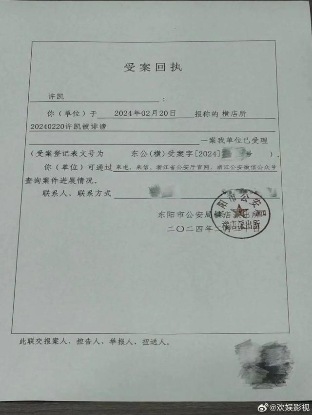 21日晚21时25分,欢娱影视发文:旗下艺人许凯先生近日被恶意造谣诽谤一事,许凯本人已报警!