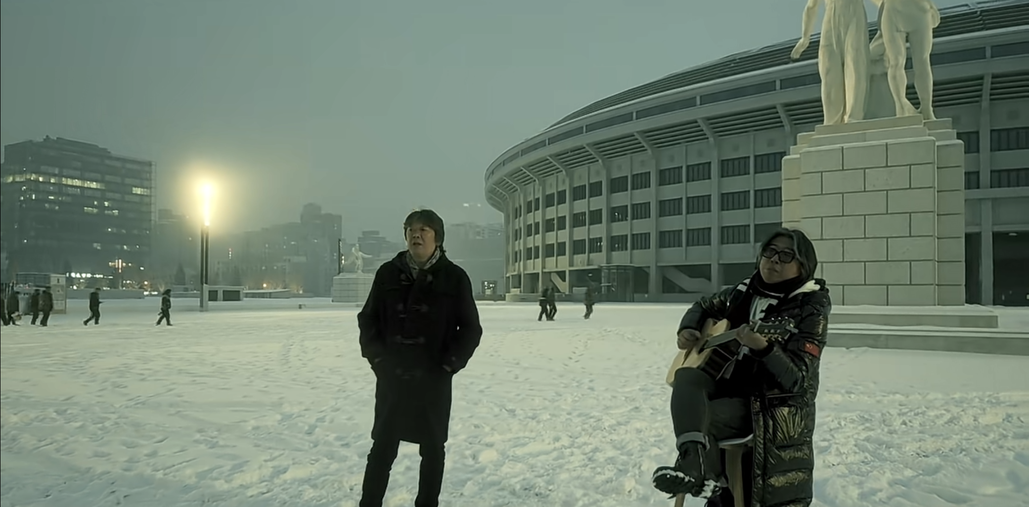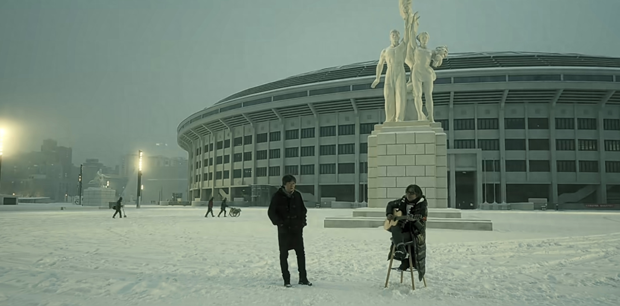 “龙年,正月十一,雪。月光下的城,城下的,灯下的人在等……等待一场春暖花开的聚会。”老狼写道,他穿着黑色大衣站立在工人体育场的雕塑前开唱,一旁的龙隆抱着吉他坐在椅子上伴奏,背景里有推着小车的工人,也有冒雪前行的赶路人……