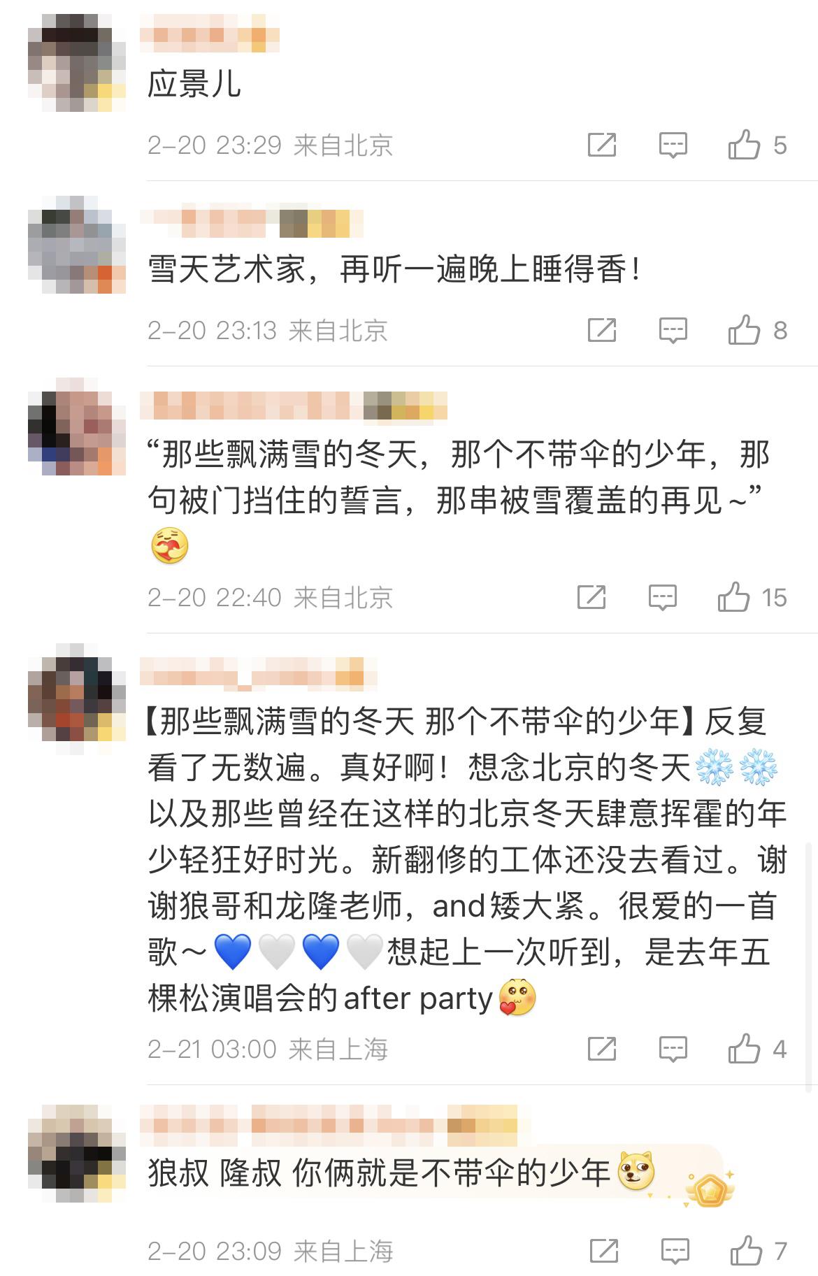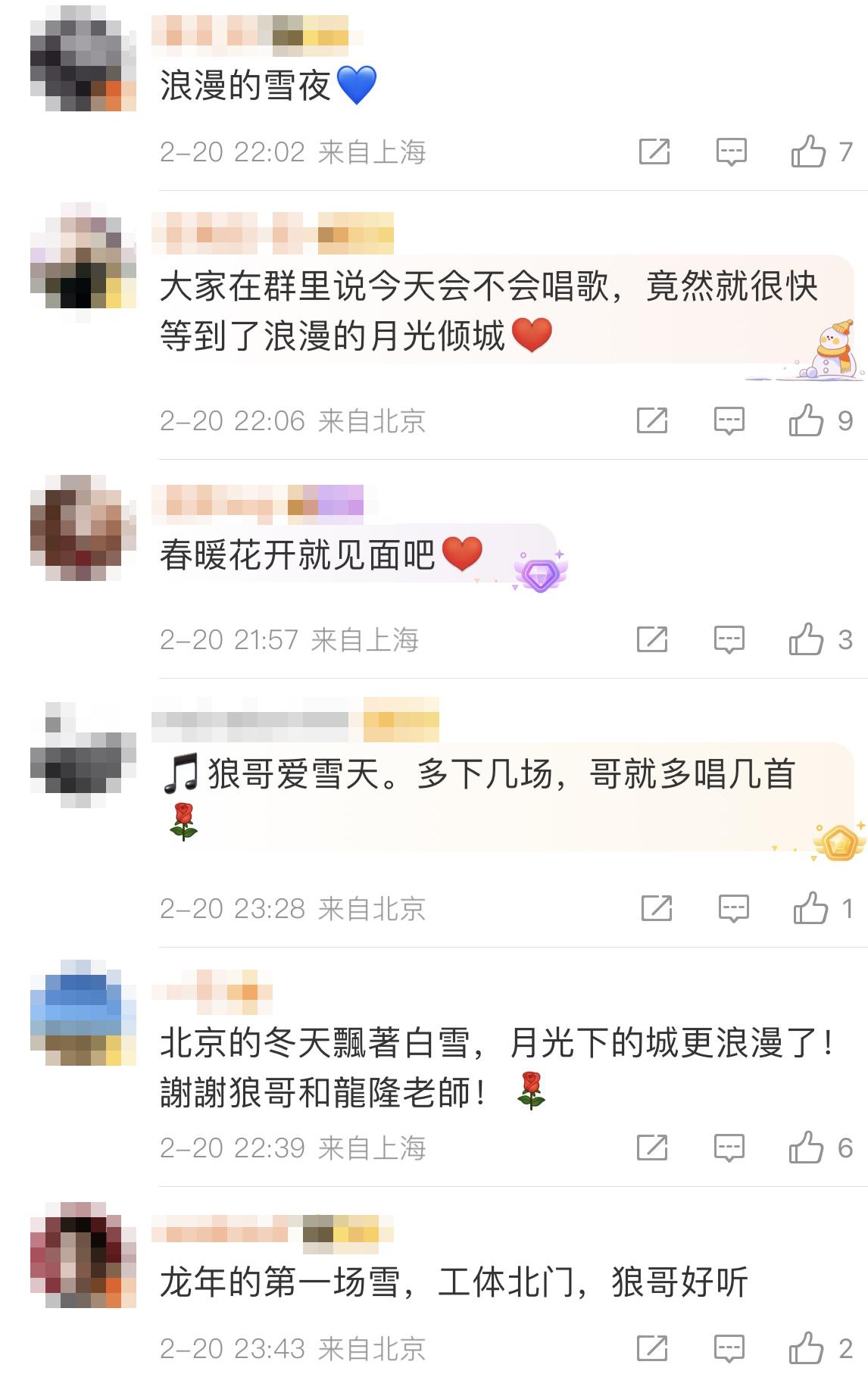 更多的人则留言道:“应景儿”“雪天艺术家!”“北京的冬天飘着白雪,月光下的城更浪漫了!”“狼叔、隆叔,你俩就是不带伞的少年”“龙年的第一场雪,狼哥好听”“浪漫的雪夜和浪漫的狼哥”“狼哥爱雪天。多下几场,哥就多唱几首“……