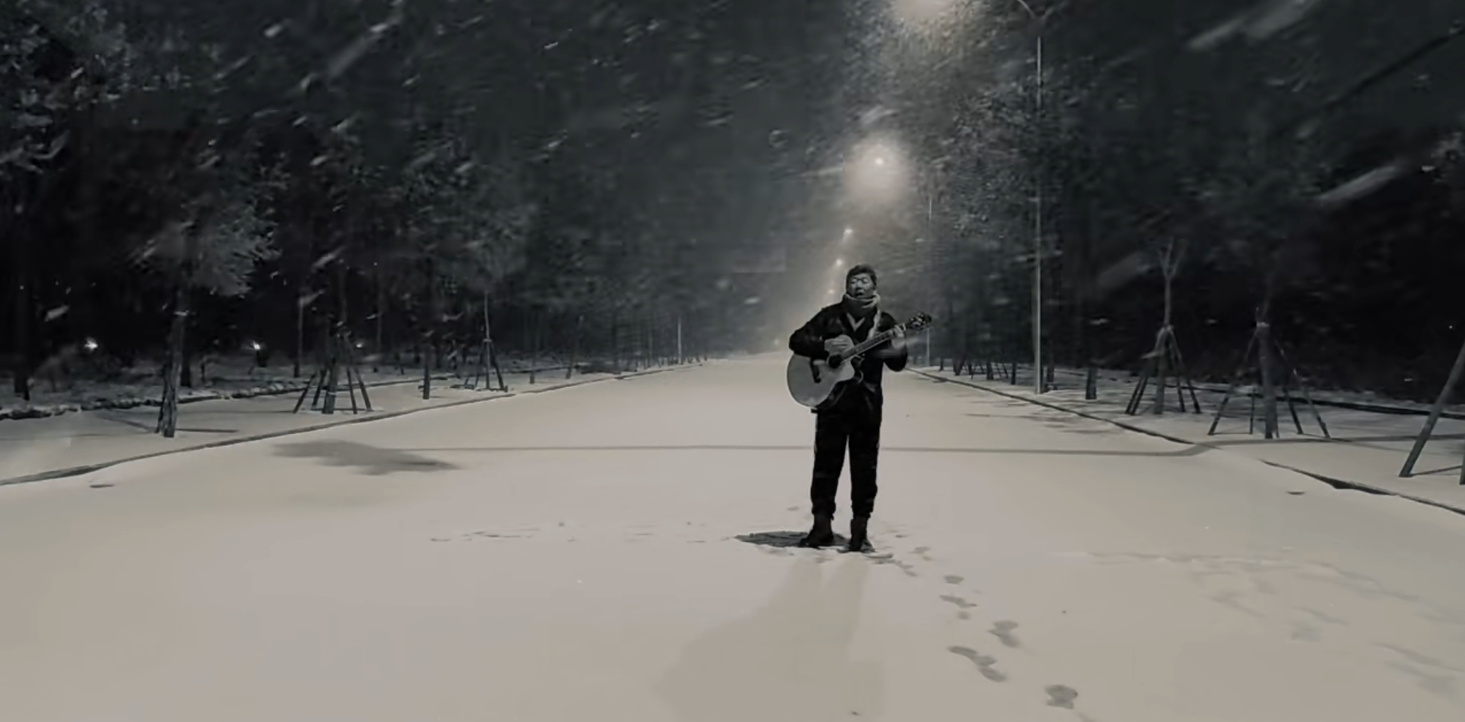2021年北京的初雪时,老狼也是抱着一把吉他,站在漫天大雪中唱歌。当时他唱了一首《北京的冬天》,歌词里有“嘴唇干裂”“候鸟飞远”“纷飞的季节”“独自在街上”,正是视频画面中的现实写照。