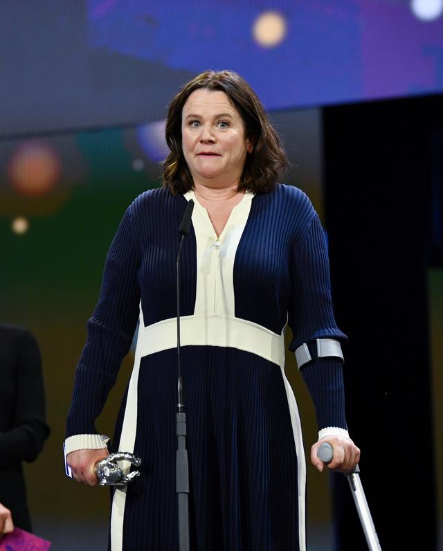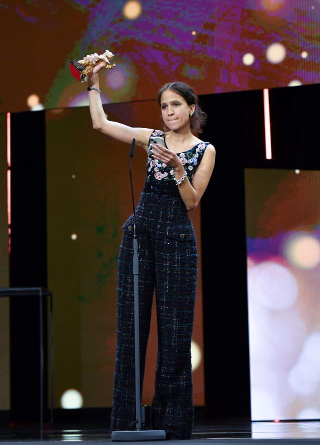 2月24日,在德国柏林,纪录片《达荷美》导演马蒂·迪奥普在第74届柏林电影节颁奖仪式上领奖。新华社记者 任鹏飞 摄
