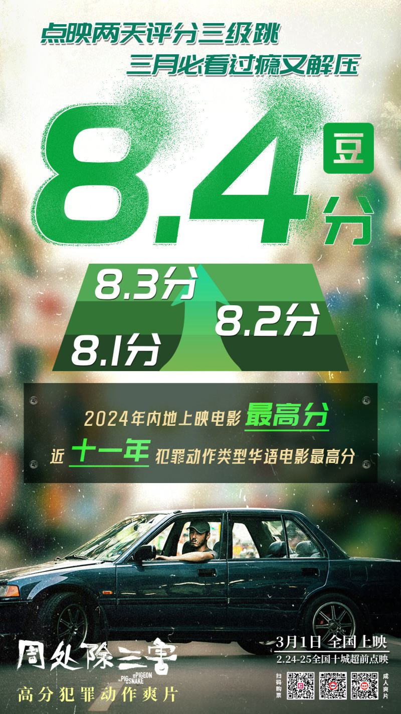 新京报讯2月26日,电影《周处除三害》发布海报,庆祝该片豆瓣评分涨至8.4。官方微博配文称:“全国十城超前点映两天豆瓣评分完成三级跳,从8.1分涨至8.4分,一跃成为近11年犯罪动作类型华语片最高分!”据悉,这一评分也是截至目前2024年内地上映电影的最高分。