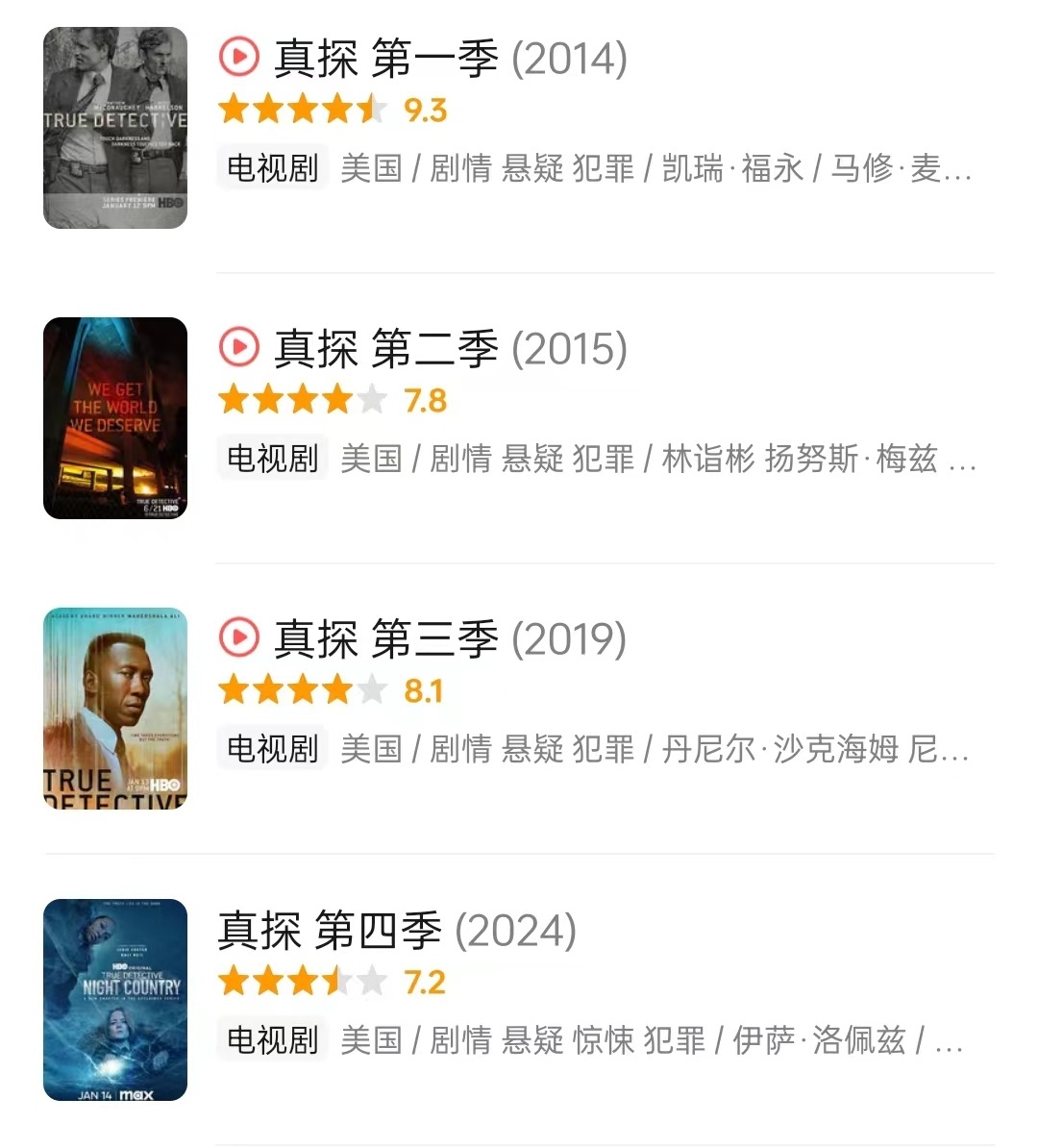 《真探》四季在豆瓣上的评分