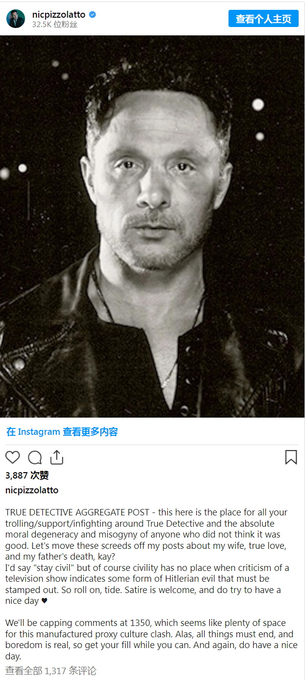 等到第四季最后一集播完,他的Instagram账号更是变得相当活跃,除亲自发文,批评第四季和第一季“强做关联,非常愚蠢”之外,还频繁转发各种批评《真探》第四季的观众留言,诸如“她们真不该盗用第一季里的经典对白”;“新一季《真探》充斥着虚假的人物与做作的情感”;“大结局写得超级潦草啊”;“编剧就是想方设法地要强调,这世界上的问题,全都出在了男人身上”;“HBO应该坚持起用尼克·皮佐拉托才对”等。