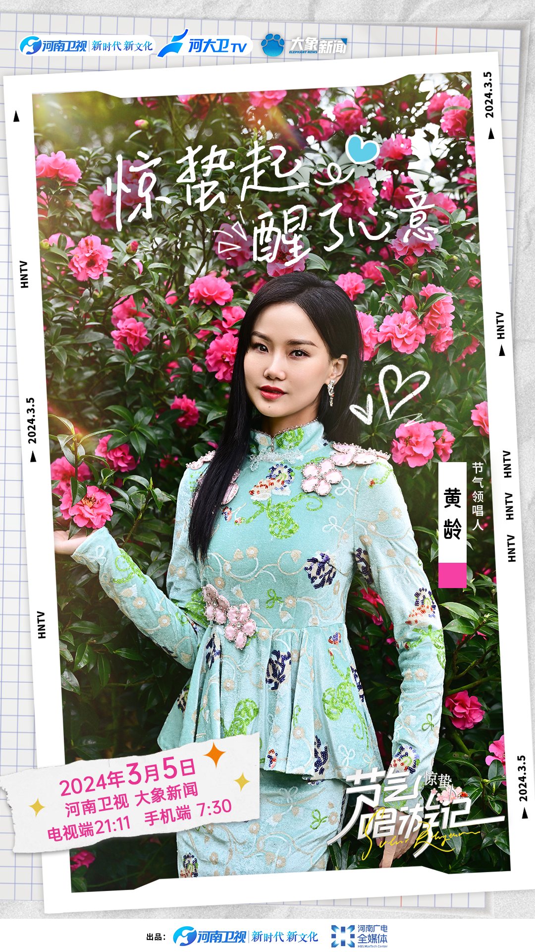 作为实力派歌手,黄龄的嗓音独特且富有感染力。节目里,她将与佛山本地文化传播视频博主佛山电翰的合作,通过剧情短片的形式,对节气主题歌曲《惊蛰起》进行全新演绎,表达惊蛰节气所蕴含的精神气节——惊蛰是每一个普通人蛰伏之后的一鸣惊人。此外,黄龄与旅行新蜜蜂乐队的合作也备受期待,他们将首次合作带来《入画江南》和《金风玉露》的舞台合唱,以精湛的演唱技巧和对音乐的深刻理解,诠释歌曲中的情感与意境。