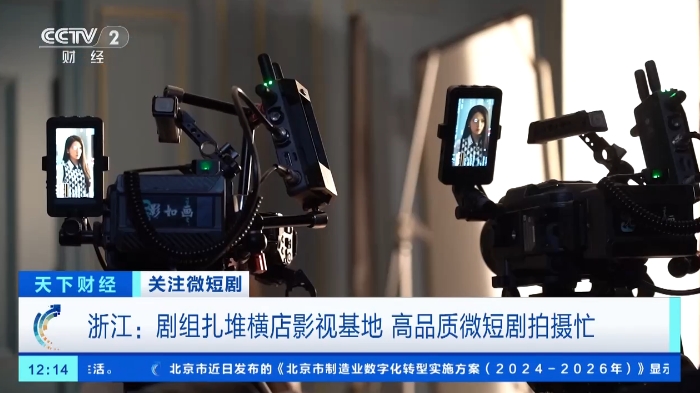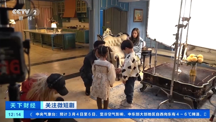 在横店影视城一栋大楼里,一个微短剧剧组正在加紧拍摄,灯光、摄影、滑轨,专业设备就位,讲戏、对词、走位,演员全情投入。