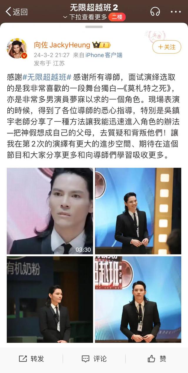 3月2日,在结束录制之后向佐发布一条微博称:“感谢所有的导师,面试的时候选择了一段自己非常喜欢的独白《莫扎特之死》现场表演的时候得到了很多导师们的悉心教诲,特别是吴镇宇老师分享的一种方法让自己快速进入角色,提议让自己代入熟悉的人,假想成自己的父母,这样帮助让也让自己能够迅速进入了角色,让其第二次表演有了更大的进步空间,也表示希望能在节目里吸收学习更多。”
