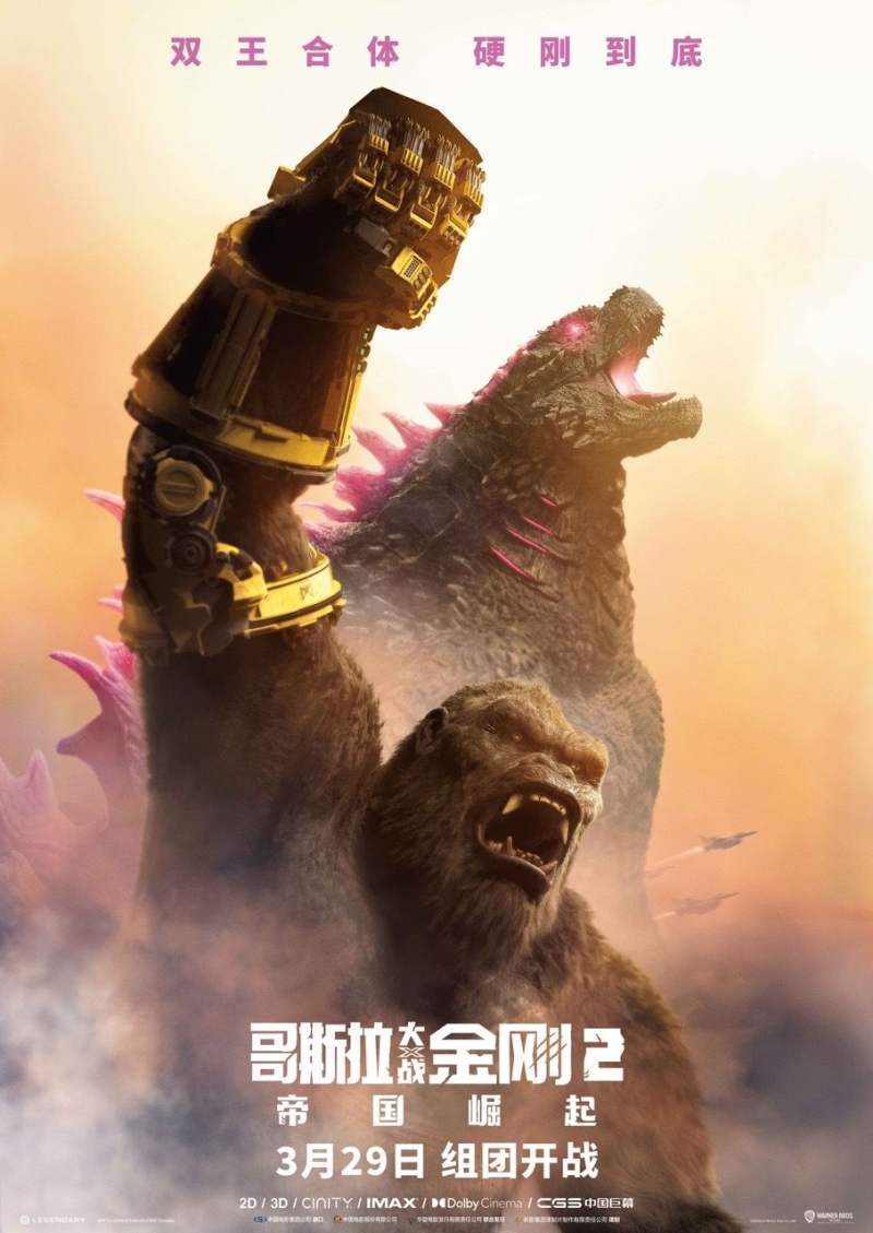 此外,片方同步曝光的海报将哥斯拉、金刚两大王者的战备形态一一展现,只见哥斯拉释放全新粉色能量霸气咆哮,一侧的金刚则高高举起佩戴着最新装备——机械手套的右臂,开启狂暴模式。