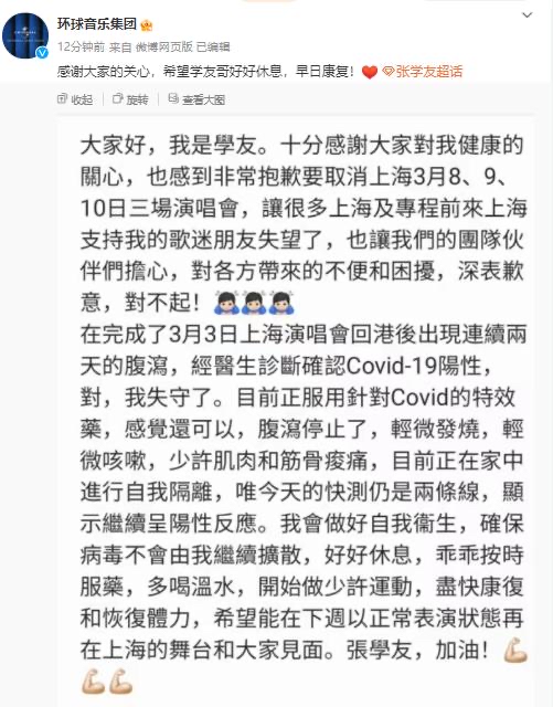 3月7日下午,CMCLive华人文化演艺官方微博发布公告称《张学友60+巡回演唱会-上海站》三场演出取消 ,并表示相关的票务解决方案将在充分征求各方意见后,于2024年3月10日22点前公布。