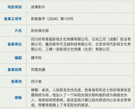 据红星新闻记者了解,黄晓明近期正在拍摄电影《阳光俱乐部》,确实在为新戏的角色增肥。该片讲述了男主角吴优和年近七旬的母亲张宝霞相依为命。他加入了一个叫阳光俱乐部的组织成为高级合伙人,母亲却突然患病。吴优坚信只要让阳光照进内心生命总有奇迹,于是,带着母亲踏上了寻觅阳光的旅途。