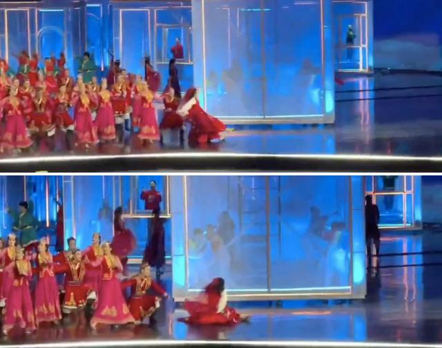 从喀什分会场现场观众曝光的一段视频中可以清楚地看到,迪丽热巴在完成第一段舞蹈后,在向舞台后方飞奔的时候,脚下一滑,当场就一屁股摔到了地上。